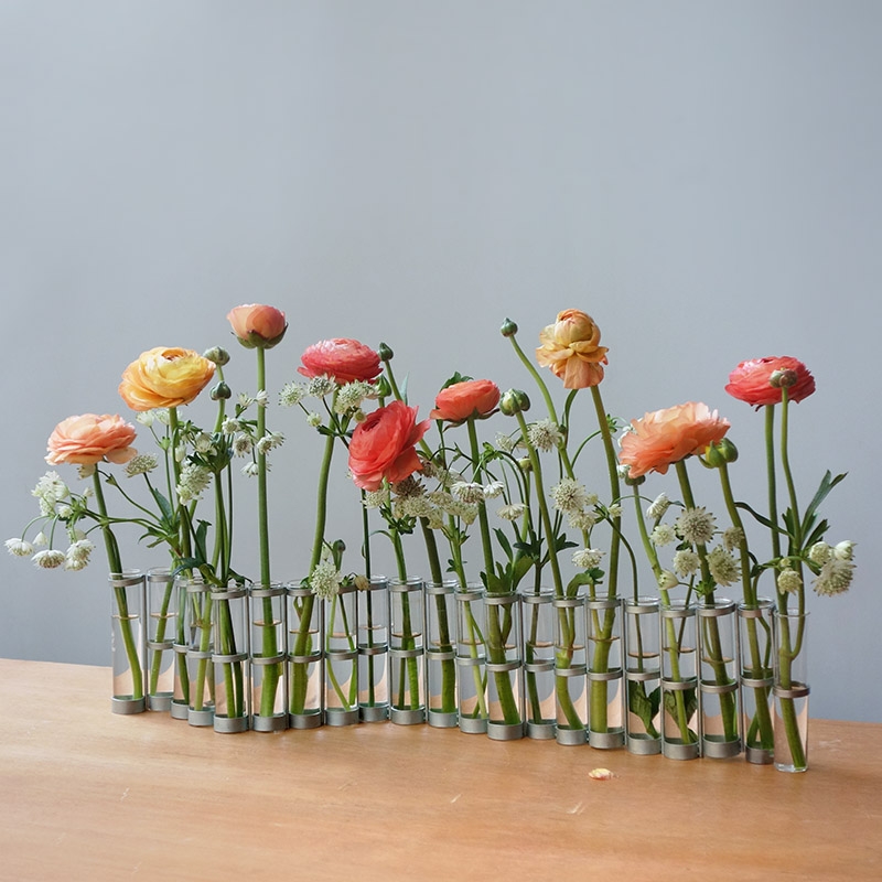 Diese kleine Aprilvase ist kleiner und feiner als das klassische Modell und wurde speziell für Wildblumen und Kindersträuße entworfen. Sie besteht aus 21 geblasenen Rohren, die in einen verzinkten Metallrahmen eingesetzt sind. Sie können die Komponenten in verschiedenen Formen und Gestalten anordnen.