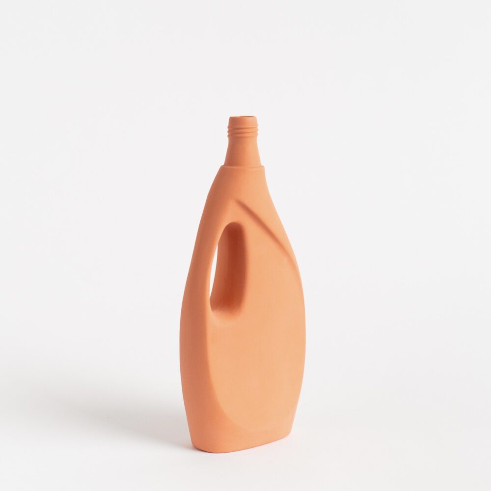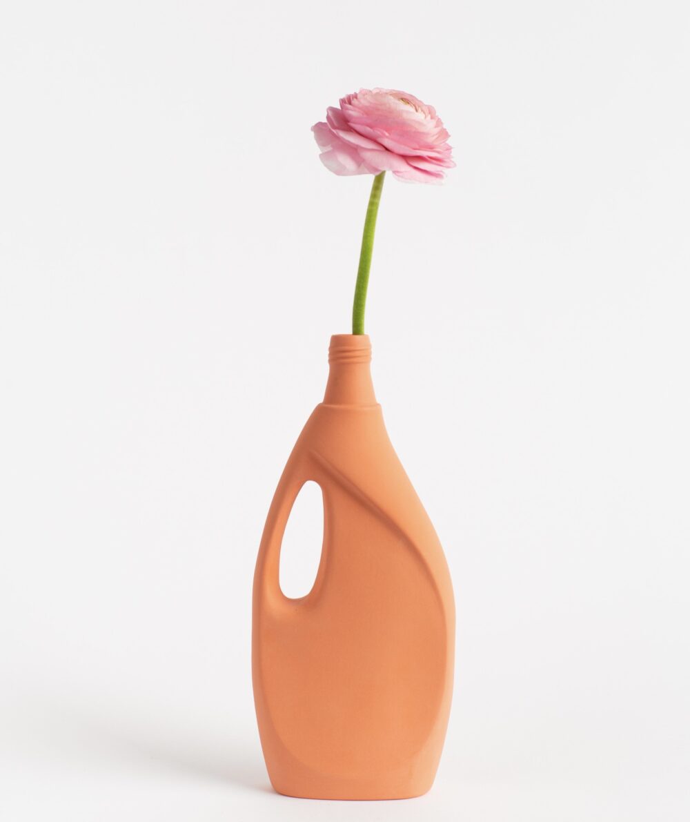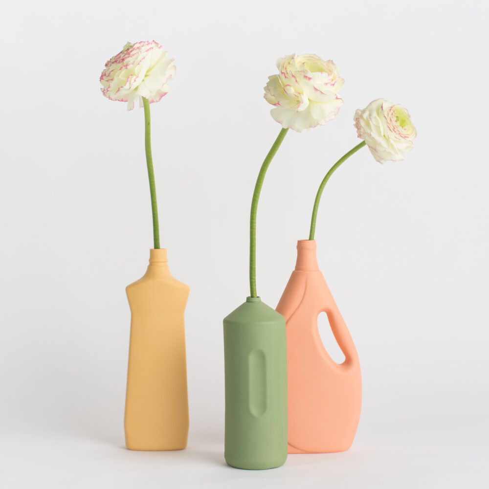 This series is handmade in Portugal. The plastic bottles are used to create molds. Pigmented liquid porcelain is poured into the molds, leaving a thin layer that forms the shape. After drying, the inside of the bottle is glazed lead-free and fired at 1300C. All this handwork is done by a team of seven craftsmen, therefore none of the bottles are exactly the same. The picture shown is an indication, minor changes in color are possible. Overall the surface is smooth but small defaults do occur and should be considered as a quality of the product. Vases will be shipped plastic-free, double boxed, and come with a brochure.