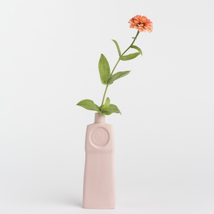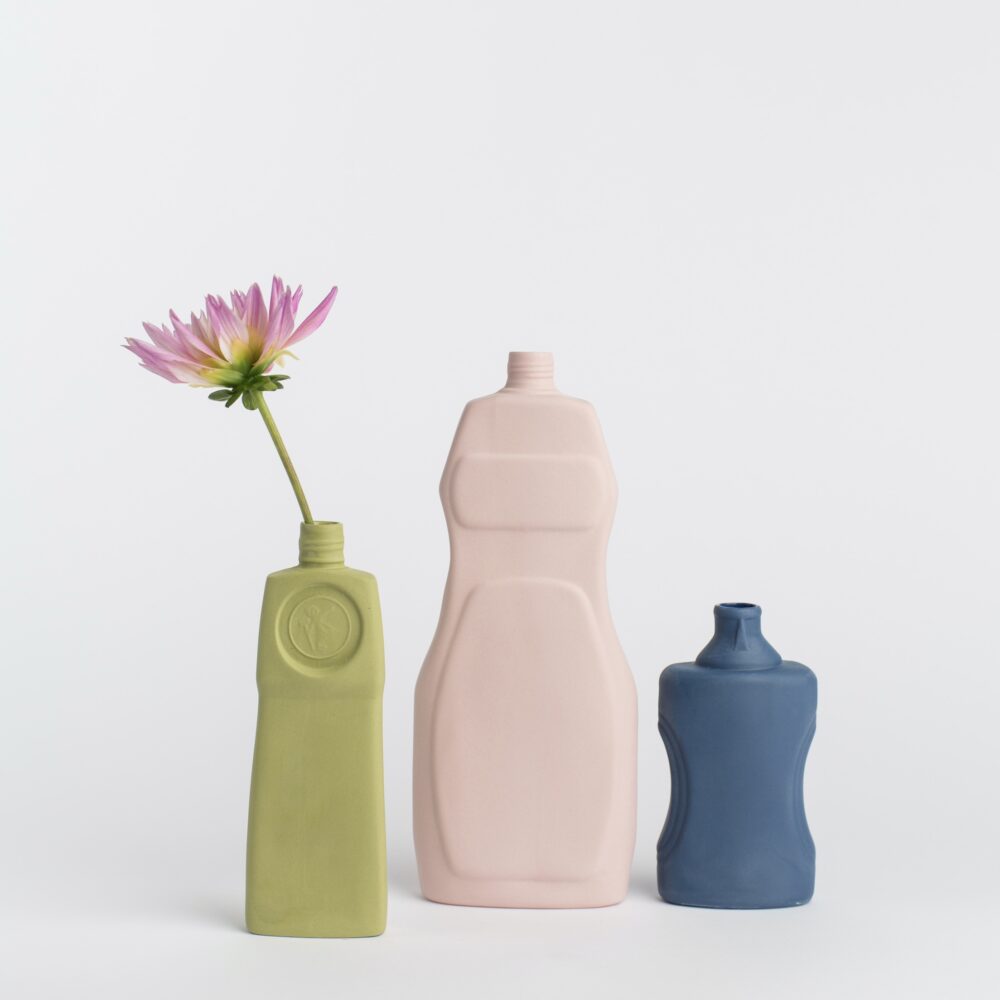 This series is handmade in Portugal. The plastic bottles are used to create molds. Pigmented liquid porcelain is poured into the molds, leaving a thin layer that forms the shape. After drying, the inside of the bottle is glazed lead-free and fired at 1300C. All this handwork is done by a team of seven craftsmen, therefore none of the bottles are exactly the same. The picture shown is an indication, minor changes in color are possible. Overall the surface is smooth but small defaults do occur and should be considered as a quality of the product. Vases will be shipped plastic-free, double boxed, and come with a brochure.