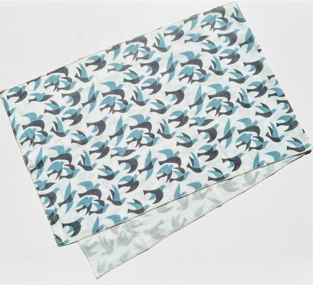 The pattern showcases a dynamic scene of a flock of birds taking flight all at once, creating a very unique design through the contrast of colors.